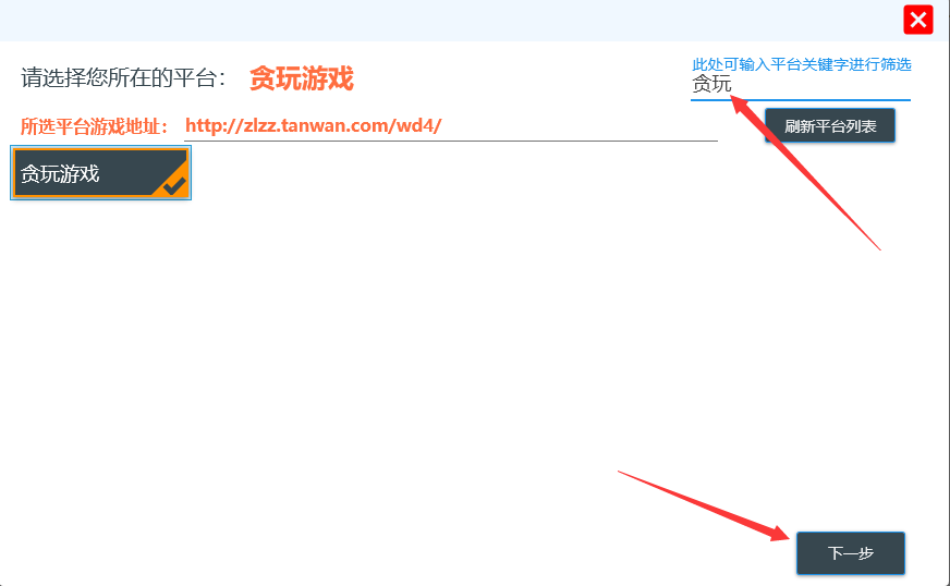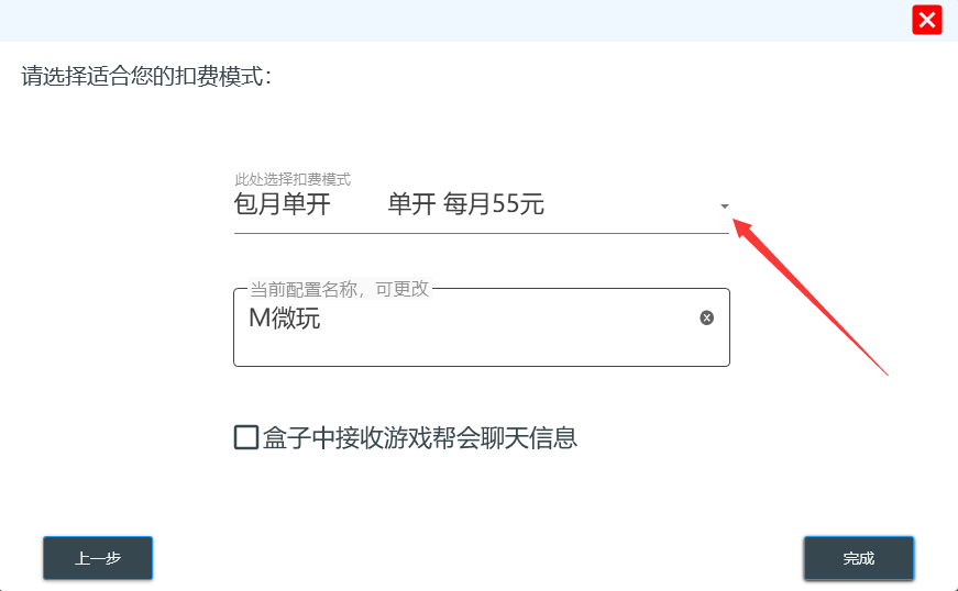 在选择游戏平台时先进行关键字筛选后点击下一步,选择相应的扣费模式点击完成